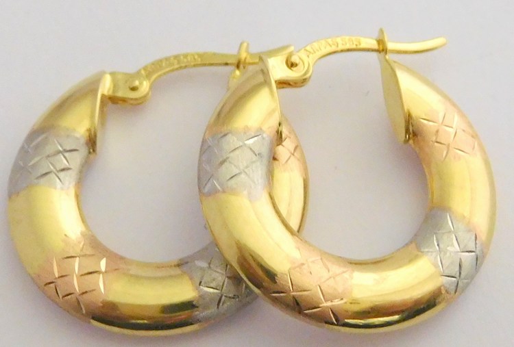 Klenoty Budín Mohutné zlaté kruhy z trojího zlata s gravírováním 585/1,68gr HK2404Skladem8 600 Kč/ ks7 107 Kč bez DPH