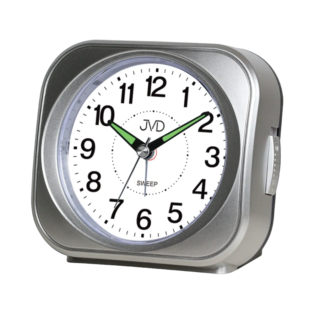 JVD Stříbrný tichý ručkový budík s LED osvětlením s plynulým chodem JVD SRP1604.2