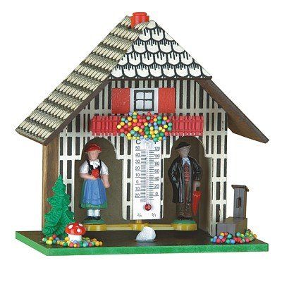 Barometr v podobě dřevěné pestrobarevné chaloupky.