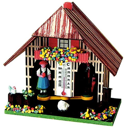 Barometr s teploměrem ve tvaru pestrobarevné dřevěné chaloupky. Bude-li pěkné počasí, z chaloupky vystoupí panenka, bude-li ošklivo ukáže se panáček. Klasika