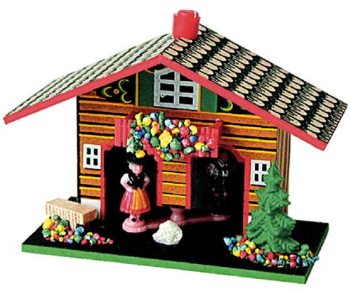 Barometr v podobě pestrobarevné dřevěné chaloupky.