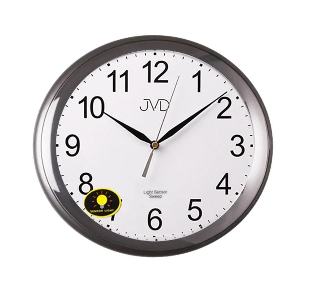 Moderní plastové hodiny značky JVD se senzorem stmívání, který rozsvítí číselník pokud je v okolí hodin málo světla a plynulým chodem zaručujícím tichý provoz.
