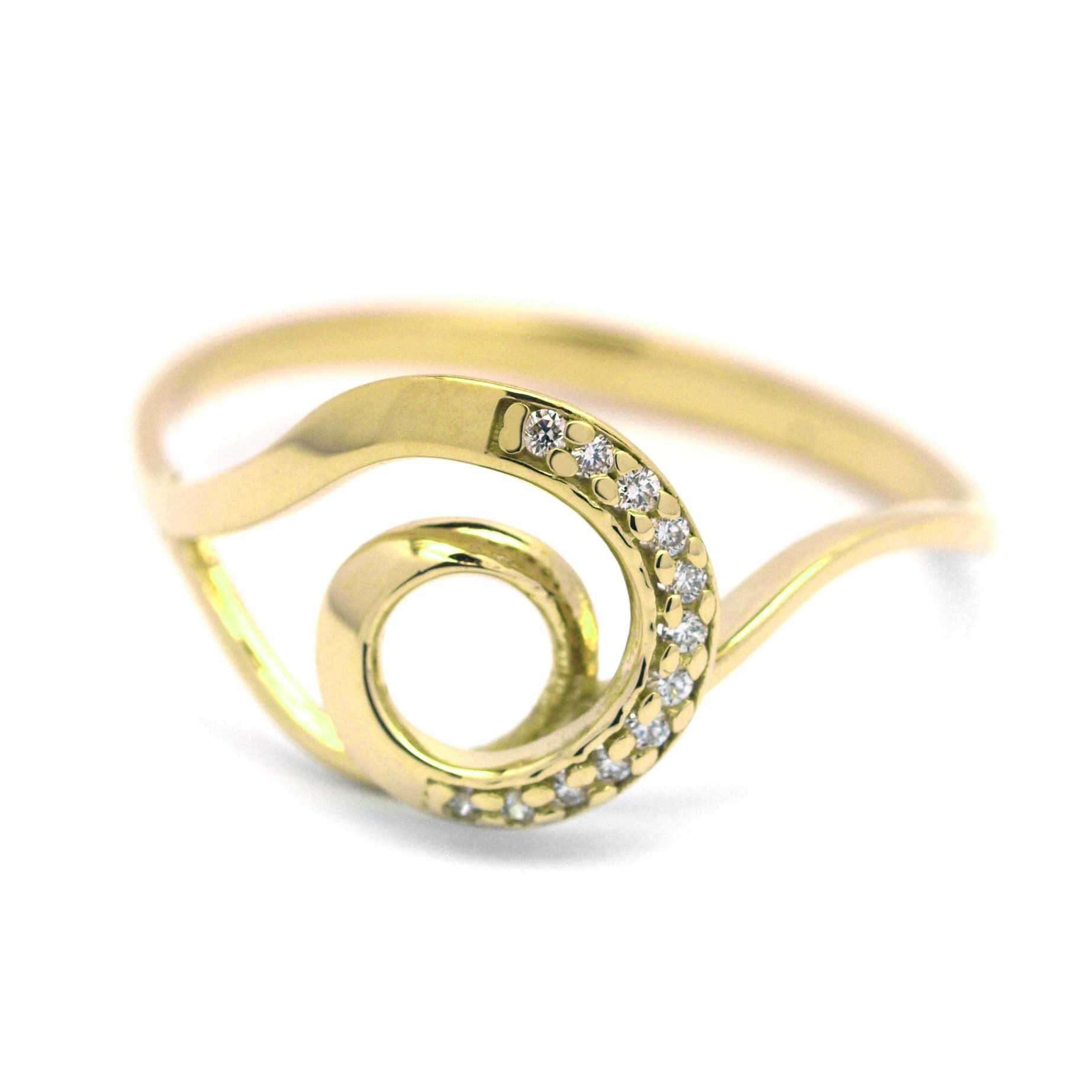 Prsten ze žlutého zlata s diamanty vyrobený kombinací ruční a strojové práce