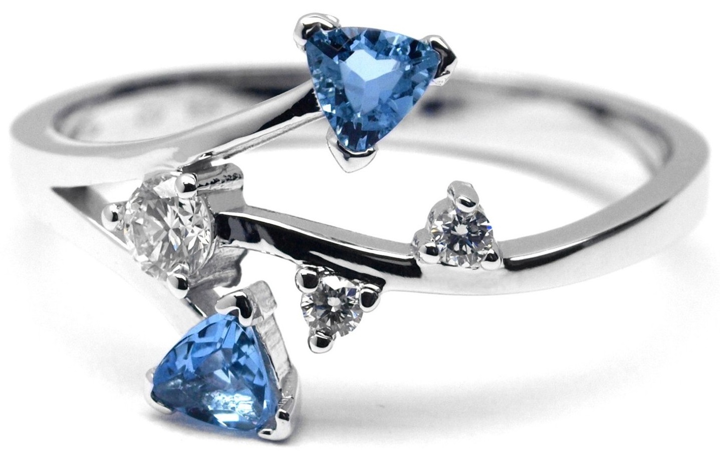 Prsten z bílého zlata s akvamarínem a diamanty vyrobený kombinací ruční a strojové práce