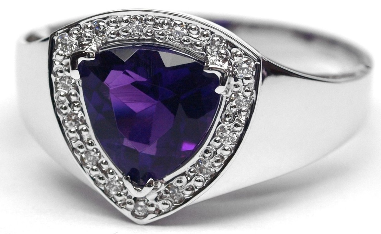 Ručně vyrobený prsten z bílého zlata s ametystem a diamanty