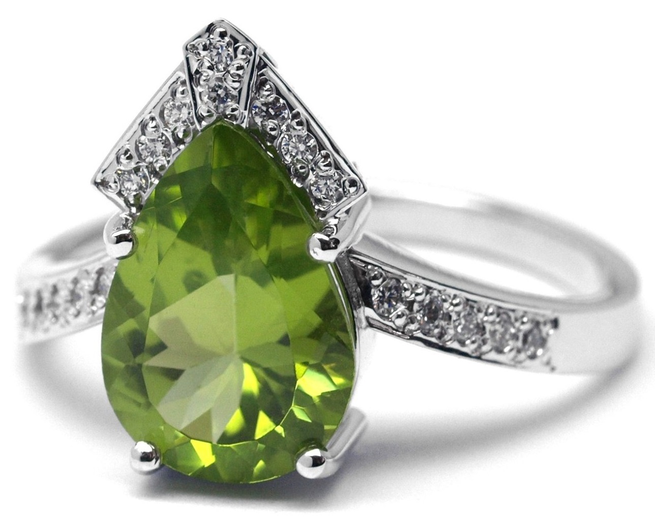 Ručně vyrobený prsten z bílého zlata s olivínem a diamanty