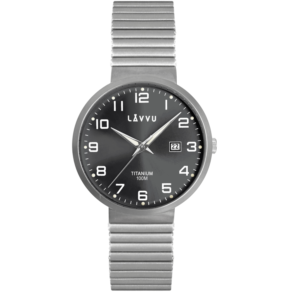Extrémně lehké a odolné titanové hodinky LAVVU TITANIUM LUNDEN s vodotěsností 100 M. Pouzdro s minerálním tvrzeným sklíčkem, ukazatelem data a praktickým pružným tahem, který nemusíte rozepínat, ale jen ho lehce přetáhnete přes zápěstí.