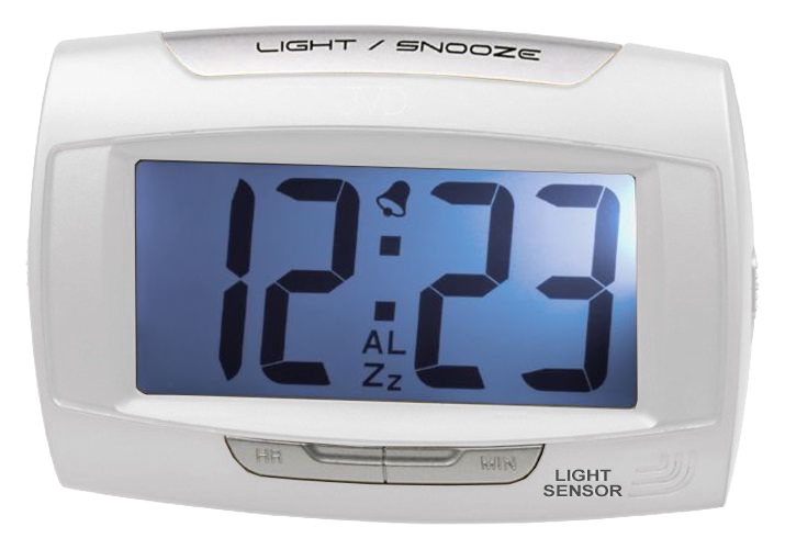 Moderní digitální budík značky JVD se světelným čidlem, který samovolně reguluje jas displeje.