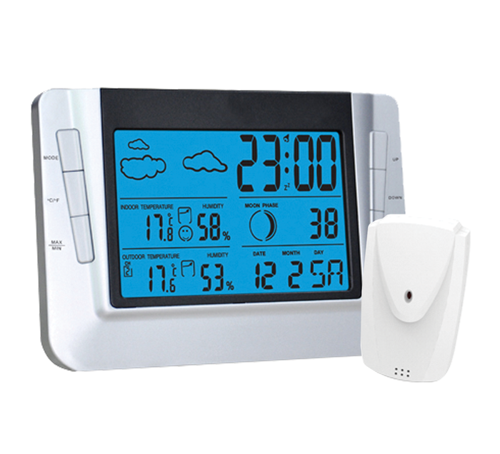 Rádiem řízená meteostanice v modrém provedení s LED podsvícením, která je naší čerstvou novinkou, Vám poslouží i jako budík. Zajistí Vám spolehlivou předpověď počasí, zobrazí teplotu, vlhkost vzduchu uvnitř i venku a také aktuální fázi měsíce. A to vš v sedmi světových jazycích.