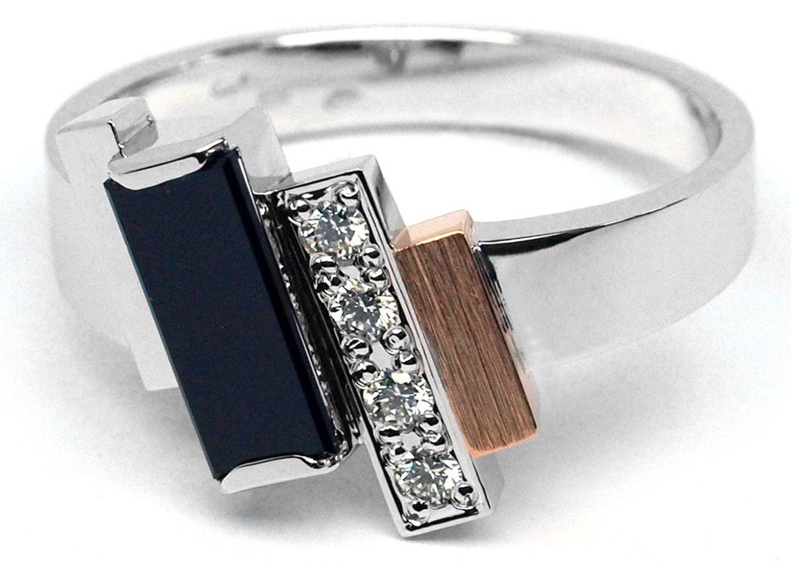 Ručně vyrobený prsten s černým spinelem a diamanty, bílé a červené zlato