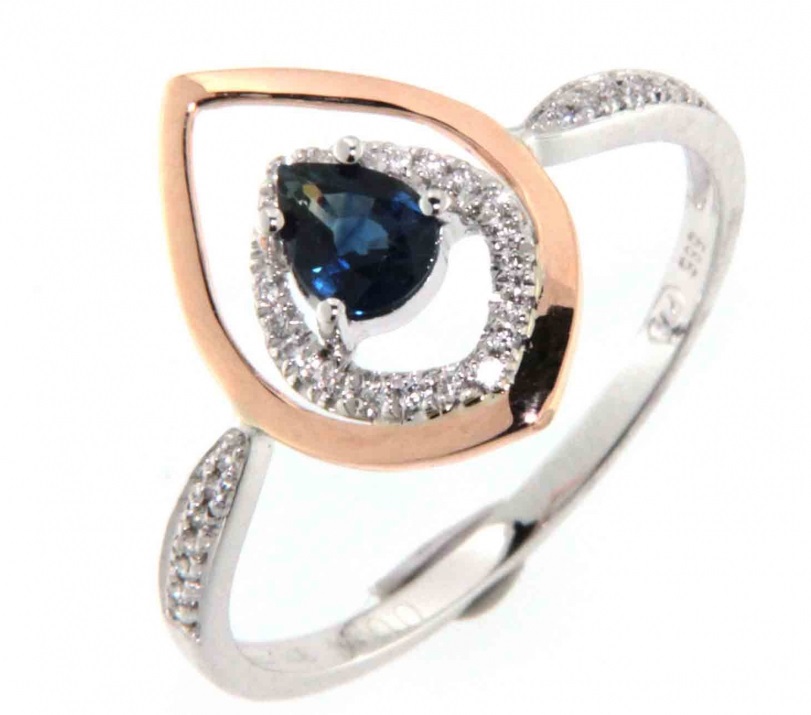 - Zásnubní prsten s diamantem s modrým safírem z bílého zlata s červenou úpravou