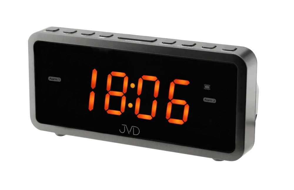 Moderní budík značky JVD do sítě se svítícími číslicemi a opakovaným buzením.