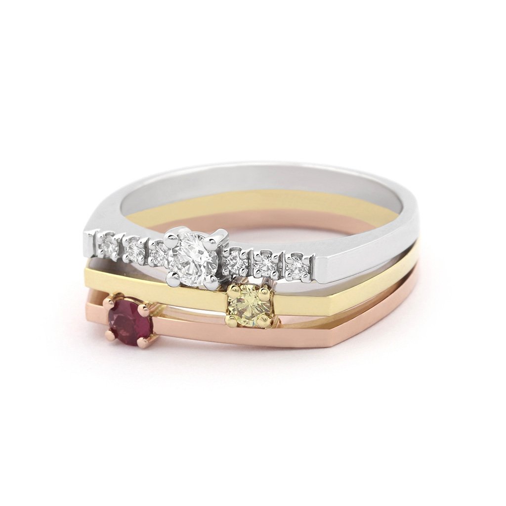 Originální prsten, vyrobený z bílého, žlutého a červeného zlata. Každá linie zlata má svůj přírodní kámen. Bílé zlato zdobí zářivě bílý diamant, žluté zlato je osazeno žlutým diamantem a v červeném zlatě je umístěn purpurově červený rubín. Díky kombinaci barveného zlata bude tento prsten jedinečným doplňkem Vašeho šatníku, který můžete nosit při každé příležitosti. K prstenu vyrábíme také přívěsek a náušnice.